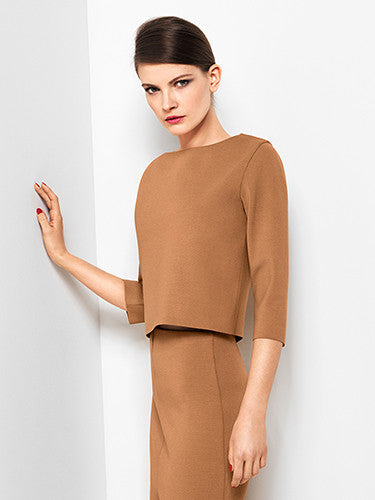 London, Milan, Tokyo – this urban, angular cropped jumper is well-received everywhere. The timeless, puristic design has an ultra-modern effect: the sleeves and the hem form a single line and the viscose material, processed according to the Milan knitting technique in an 18-gauge knit, make it especially exquisite. When combined with the slimline skirt from the same series, an impressively elegant outfit for the modern jet-setter is created.