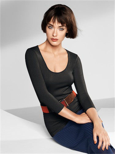 Sparkle in gold ... This seamless pullover, with its beautiful neckline and three-quarter length sleeves brings together soft velvet material and the glitter of lurex. The usual high quality from Wolford is evident in the shimmering fibre and the comfortable feel against the skin. Complete the look with a stylish belt from the current Wolford collection.