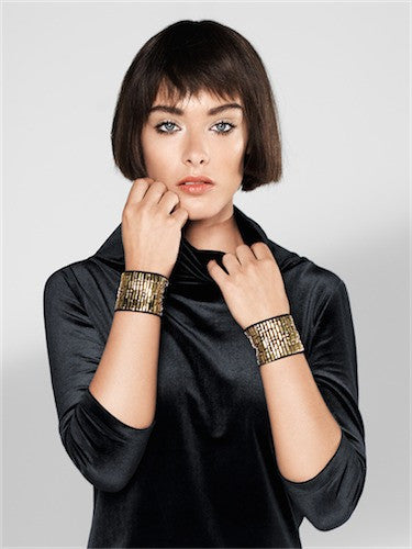 This bracelet can instantly transform a plain look into a party outfit. Gold and glittery metallic detailing adorns the soft velvet material to create an eye-catching accessory at evening events. For even more glamour, combine with a pullover or tights featuring the same design.