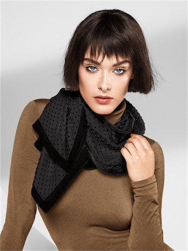 This scarf embodies the perfection of elegance. One side is decorated with velvet polka dots, whilst the other is plain and smooth. It's the perfect wardrobe companion because it successfully complements items from the current collection, making it perfect for a business meeting, dinner or leisure activities.