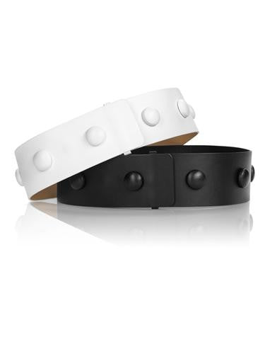 Midriff revisited: waist belt, fashionably decorated with chunky leather buttons. To retain the all-over effect, the belt is fastened on the inside with concealed pop buttons. A particularly versatile accessory that goes well with all sorts of styles.