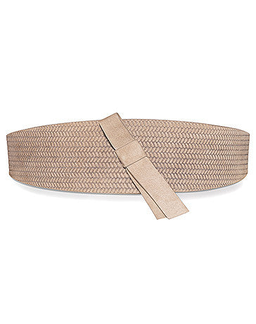 Very stylish wide belt made of soft nubuck leather: The embossed pattern is reminiscent of wickerwork, making this a favourite summer look. The simple leather bow, which is applied at an angle in the centre front of the belt, is a particularly pretty detail. The narrow, sewn-on belt ends join together in the back and are held in place with a golden clasp.