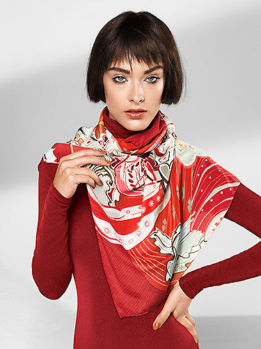 This classic silk carré scarf is certainly a cut above the rest. It artistically combines the various design inspirations of the season and the on-trend composition of colours enables it to be stylishly combined with almost any outfit. The flattering silk ensures a cosy feel, whilst the elaborate edges are rolled by hand to create a highly artistic finish.